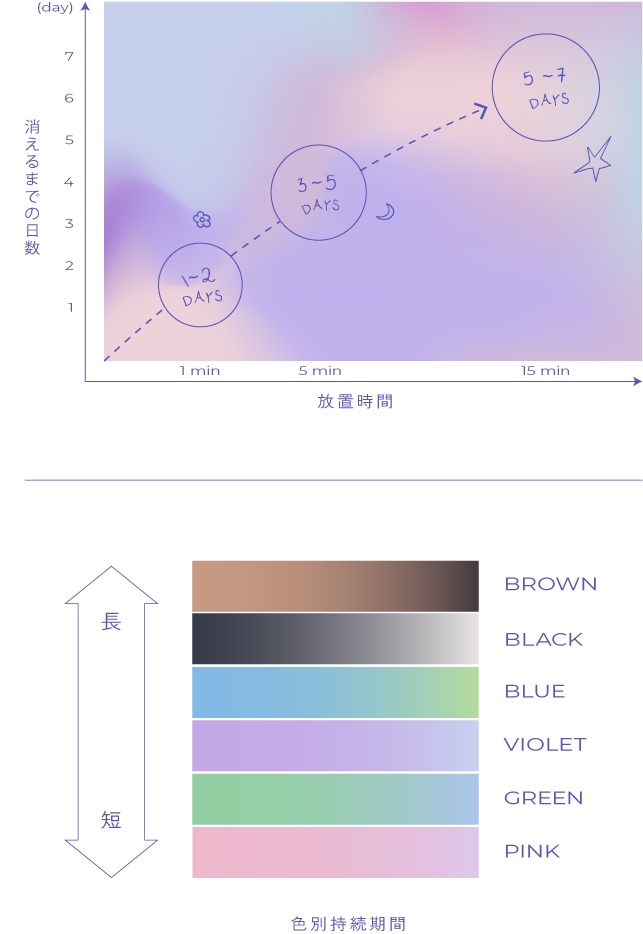 ティント式タトゥーは、一定期間で自然に消えるインスタントタトゥーです。インクを塗布してから拭き取るまでの置き時間によって、発色の持続期間が変わります。デザインを楽しみたい期間に合わせて、置き時間を調整して好きなように楽しめるのも、このブランドの特徴です。