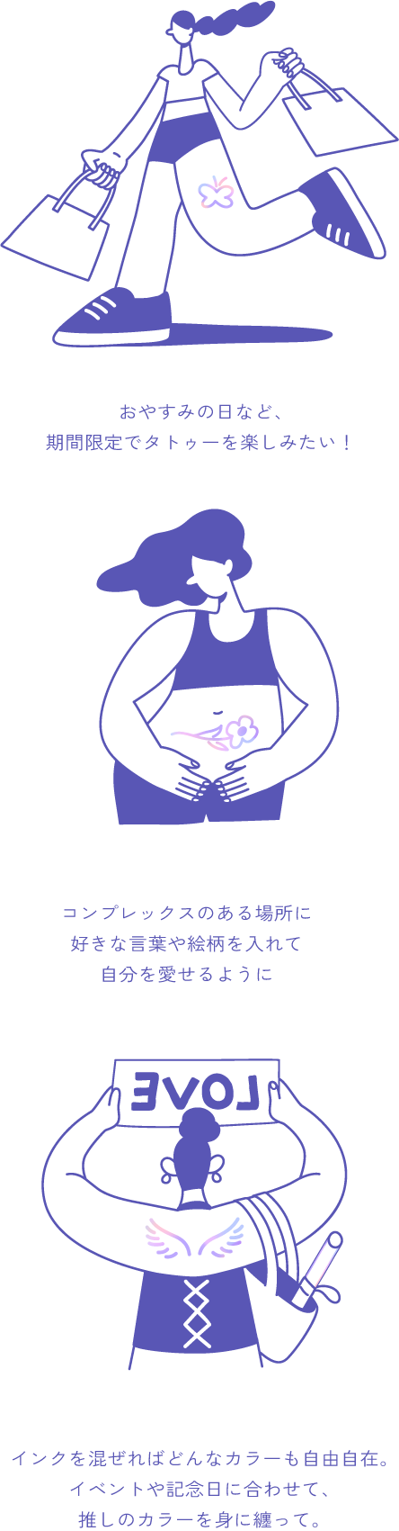 「好き」を体に宿すこと。ほんの小さなマークや柄が、わたしをちょっと強くする。コンプレックスだったパーツも、Tattooを入れてみればなんだか愛おしく見えてくる。Tattooはもう、Tabooじゃない。色と個性に向き合い続けたhoyuだからこそできる、自由で、カラフルで、パワフルな、新時代のインスタントタトゥー、誕生。
