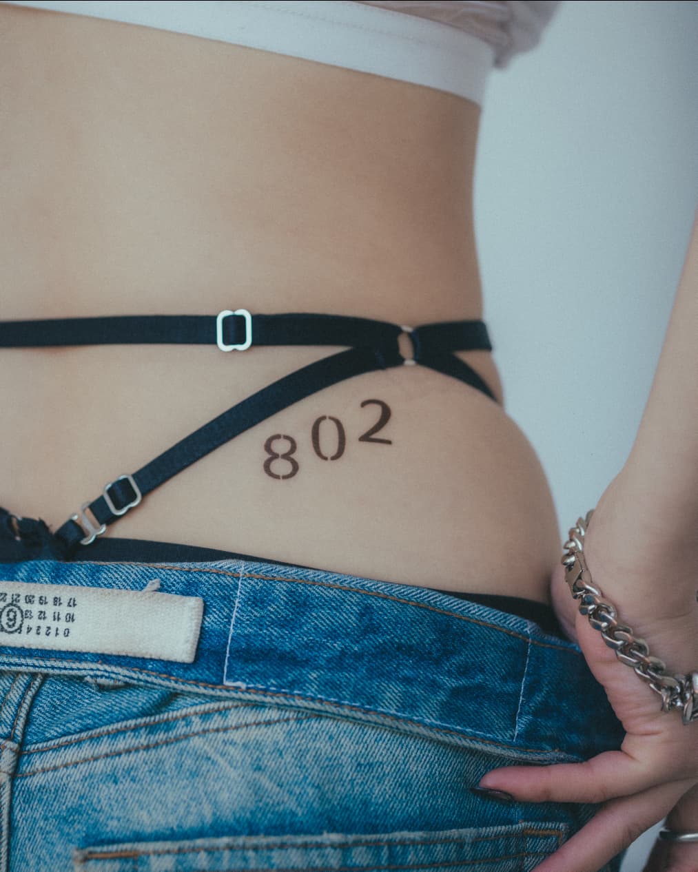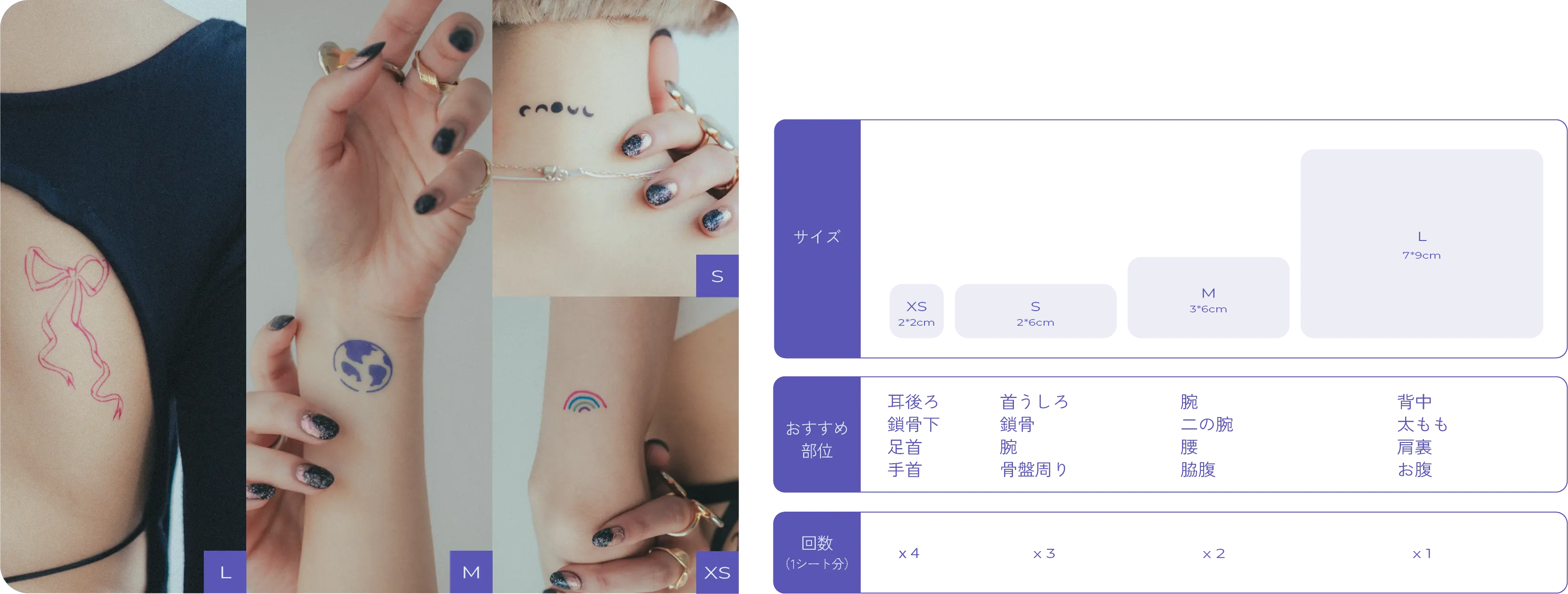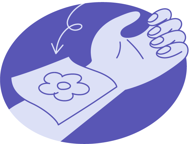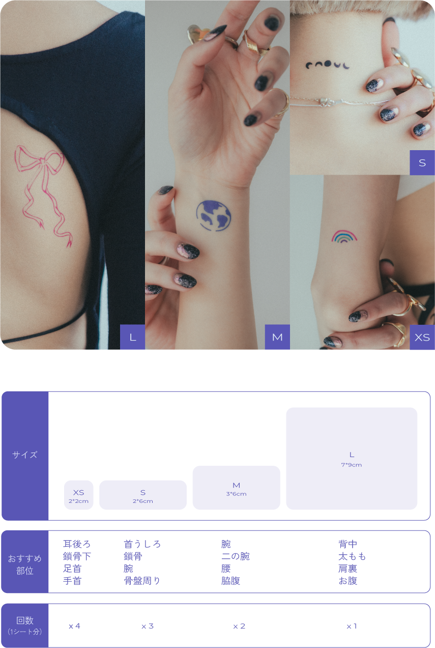 水気を切ってから、デザインステッカーを優しく肌から剥がせば、ティント式タトゥーの完成です。強く引っ張ると肌を傷めてしまう恐れがありますのでご注意ください。